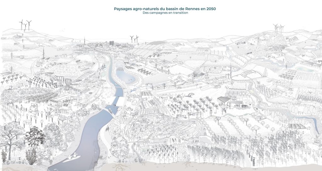L’étude identifie également d’autres travaux « paysages & climat » inspirant, en Bretagne et ailleurs, dont l’exploration des paysages agro-naturels du bassin de Rennes en 2050, réalisée par l’Audiar sous forme de fresque dessinée et commentée.