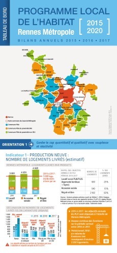 Sur Rennes Métropole, 4 282 logements ont été livrés, par an, entre 2015 et 2017 pour un objectif initial annuel de 3 600 logements. 961 logements locatifs sociaux ont été livrés par an sur la même période pour un objectif annuel de 900. C’est ce que montre le premier tableau de bord du Programme local de l’habitat (PLH) réalisé par l’Audiar avec l’appui du service Habitat. Composé de 9 indicateurs de suivi, ce tableau de bord synthétique a pour but de décliner et de quantifier :