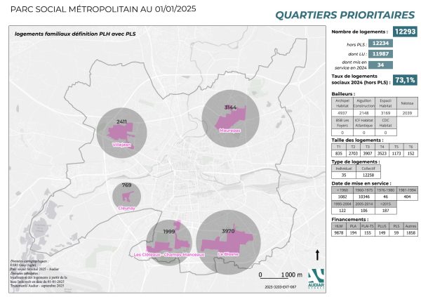 Rennes compte un peu plus de 28 300 logements sociaux (PLS compris) au 1er janvier 2025, soit près du quart des résidences principales. Cet atlas précise la localisation et les caractéristiques du parc social sur chacun des 12 quartiers, dont les 5 quartiers de la politique de la ville (QPV) où sont recensés 43 % de l’offre rennaise et où l’habitat social représente plus de 7 résidences principales sur 10.