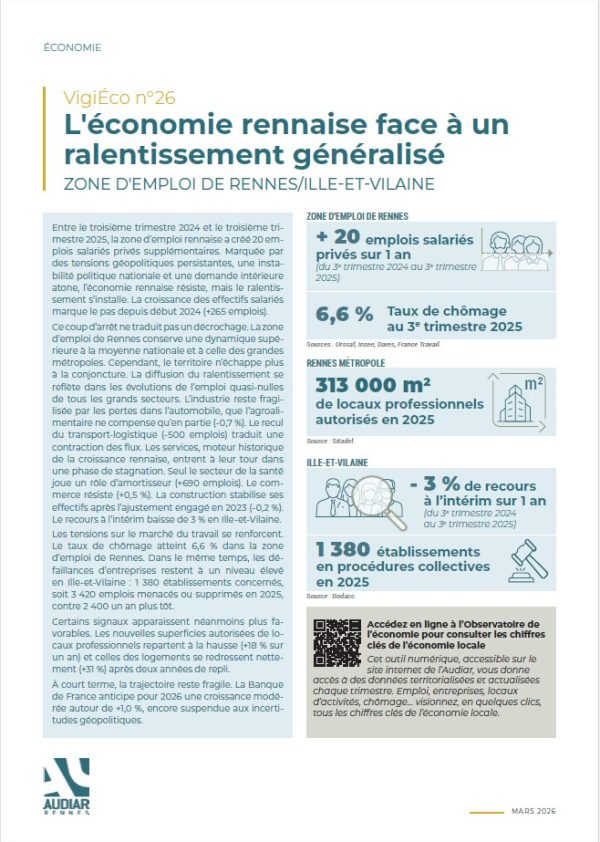 La zone d’emploi de Rennes entre dans une phase de ralentissement. Dans un contexte marqué par les incertitudes géopolitiques et une demande atone, l’économie locale marque le pas. Sur un an, la zone d’emploi ne crée que 20 emplois salariés privés même si le territoire conserve une position légèrement plus favorable que la moyenne nationale.