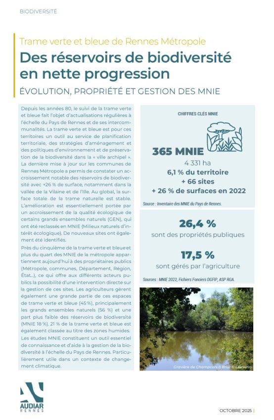 La connaissance de l’évolution de la trame verte et bleue fonctionnelle est portée par le Pays de Rennes au travers des milieux naturels d’intérêt écologique (MNIE). La dernière actualisation en 2022 sur le territoire de Rennes Métropole a permis de constater un accroissement notable de 26 % de la surface des MNIE. Pour autant, au global la surface de la trame verte et bleue naturelle est plutôt stable et cette évolution est essentiellement portée par une amélioration de la qualité écologique au sein de certains grands ensembles naturels (GEN), grands corridors écologiques, reclassés en MNIE, réservoirs de biodiversité. De nouveaux sites ont également été identifiés.