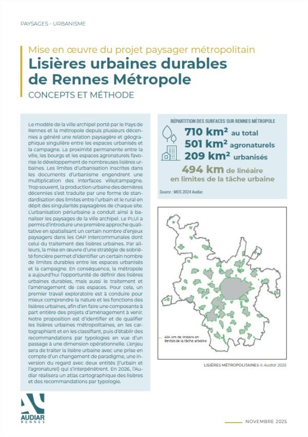 Le modèle métropolitain de la ville archipel crée de nombreux espaces d’échanges entre les zones urbaines bâties et les espaces agronaturels. Ces espaces interstitiels, appelés lisières urbaines, se situent à la croisée d’enjeux paysagers, écologiques, environnementaux et d’usages. L’élaboration de nouvelles stratégies de consommation foncière des collectivités, en lien avec la révision du SCOT du Pays de Rennes et la loi ZAN, pose la question des lisières urbaines. Ce nouveau paradigme propose d’inverser la manière de percevoir les lisières afin d’en faire un véritable projet d’aménagement. Jusqu’où pourra s’étendre le développement urbain ? Quels critères prendre en compte ? Comment rendre ces lisières plus qualitatives ? L’AUDIAR propose ici une méthodologie d’analyse des lisières sur la métropole en vue de formuler des recommandations par typologie.