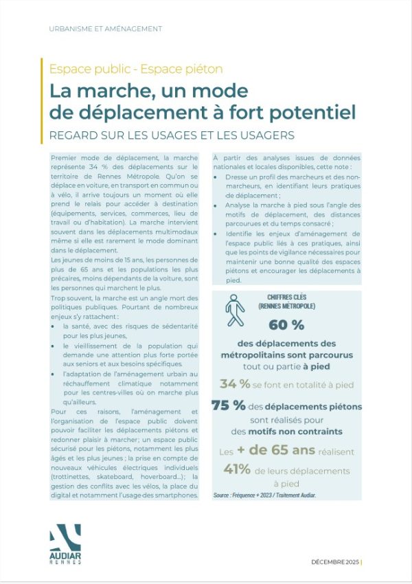 À Rennes Métropole, 60 % des déplacements intègrent la marche, 34 % d’entre eux sont effectués entièrement à pied. Les Rennais sont particulièrement concernés, 75% de leur déplacement sont réalisés tout ou partie à pied. Cette note met en lumière les profils des principaux marcheurs (jeunes, seniors, populations précaires) et souligne les enjeux liés à la santé, au vieillissement et à l’adaptation des espaces urbains face au réchauffement climatique. La marche est surtout utilisée pour des trajets courts (moins de 1,5 km) et des motifs non contraints (loisirs, achats). Cependant, des freins persistent, comme le manque d’aménagements adaptés pour les publics fragiles, la cohabitation avec les nouveaux usages (trottinettes, vélos, etc.) ou encore les épisodes de forte chaleur. L’étude préconise la nécessité de rendre les villes plus « marchables », en améliorant le confort d’usages et l’inclusivité des espaces publics, tout en intégrant les défis environnementaux.